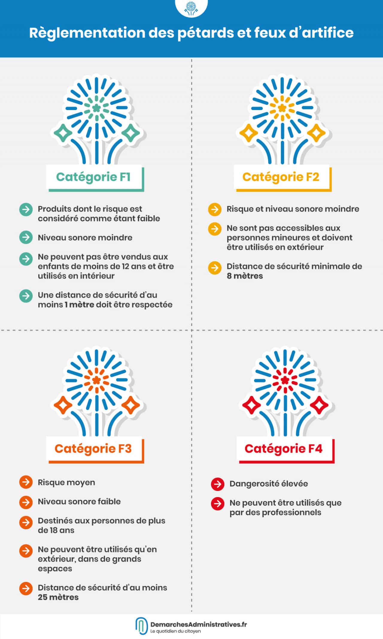 Les feux de catégorie F4 sont interdits aux particuliers, ils ne peuvent être mis en œuvre que par des professionnels.